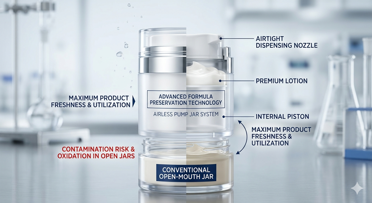 에어리스 펌프 용기 위생, 안정성 및 투여 정밀도 측면에서 기존 나사식 병보다 성능이 뛰어납니다. 기술적 차이를 더 잘 이해하려면 6개월 동안 활성 성분 안정성에 대한 실험실 관찰을 기반으로 한 다음 성능 지표 비교를 고려하십시오.